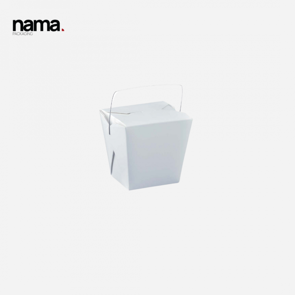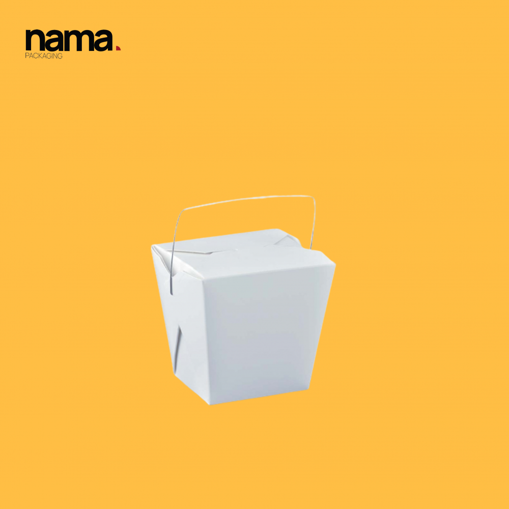 حقيبة ورقية لون ابيض بحامل سلك معدني مصنعة من الورق الصحي مع طبقة حماية تستخدم للمأكولات الساخنة مثل المعكرونات والمعجنات والحلويات وايضا للسلطات